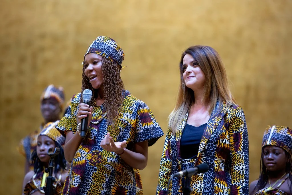 Reina Hounkpatin es la delegada en Benin de la ong Juntos por la Vida «Trabajamos en Benin con niños vulnerables, de familias muy pobres. Identificamos a estos niños para darles formación y que tengan un lugar para divertirse. Con estos niños hemos formado Voces por Benin, para defender los derechos de la infancia, promover la cultura africana y cantar por los derechos de las mujeres. Esta gira es una oportunidad para estos niños porque nunca han salido de su país, y es una nueva experiencia para ellos, y están muy felices».