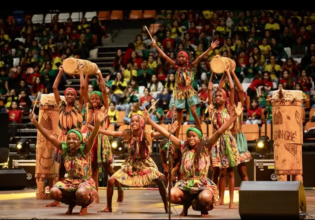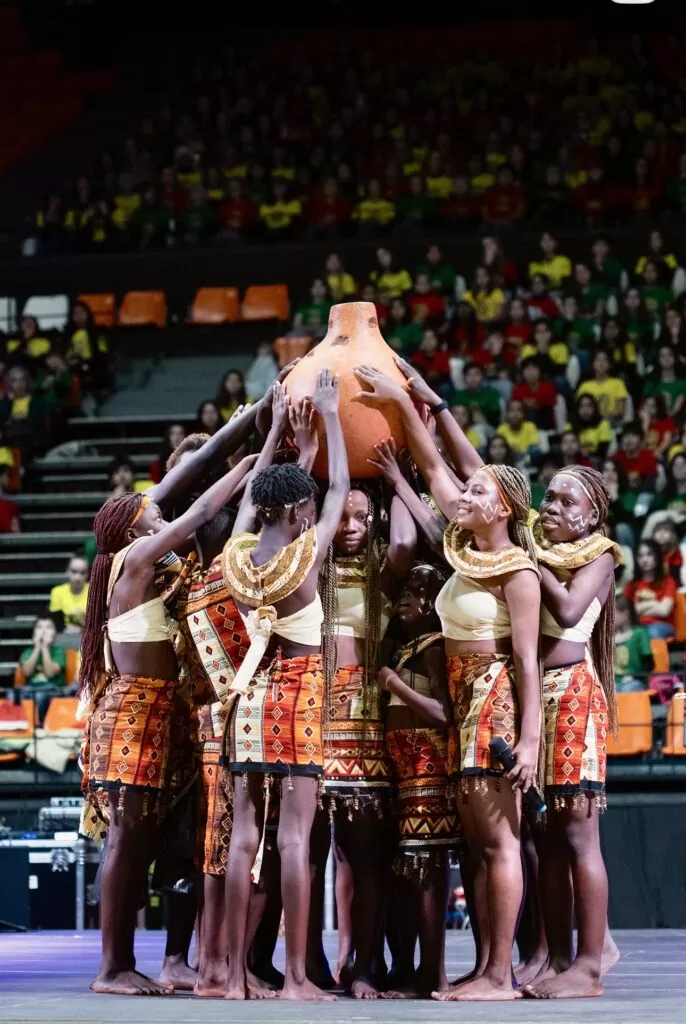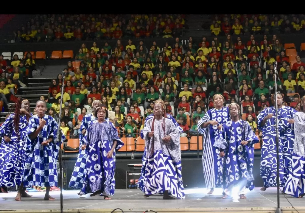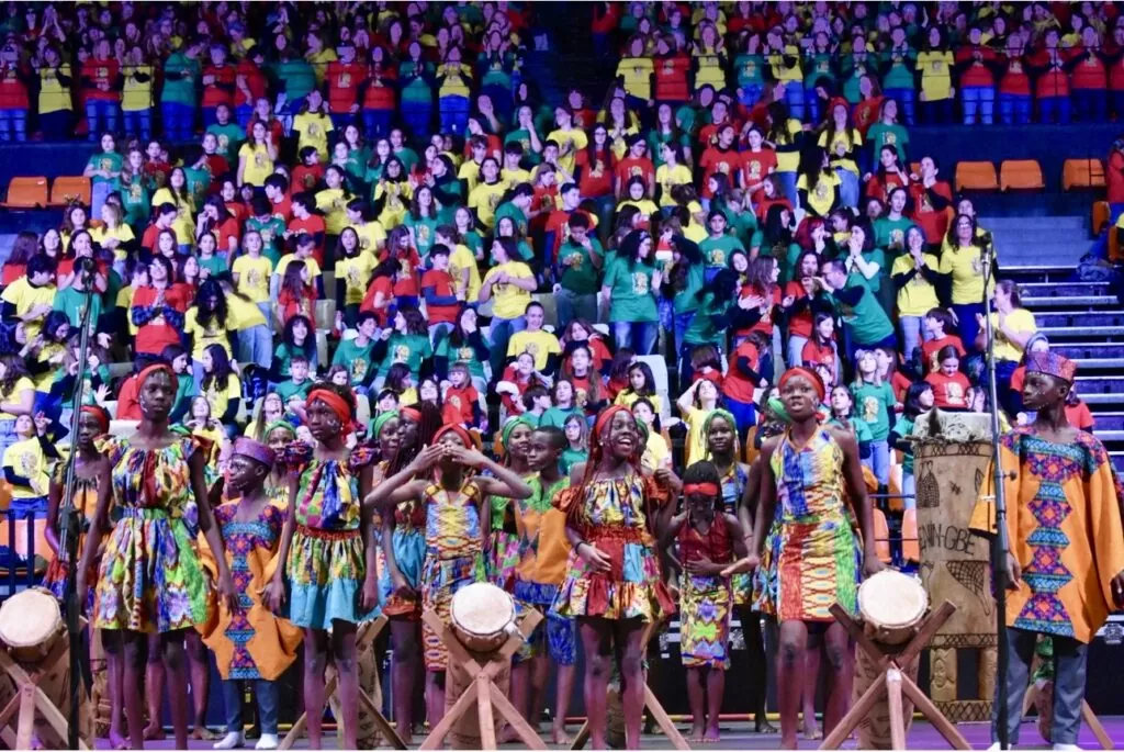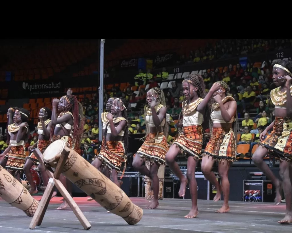 Los coralistas de las distintas agrupaciones infantiles, juveniles y de adultos, situados en las gradas tras el escenario, vestían camisetas con los colores rojo, verde y amarillo, colores de la bandera de Benin.